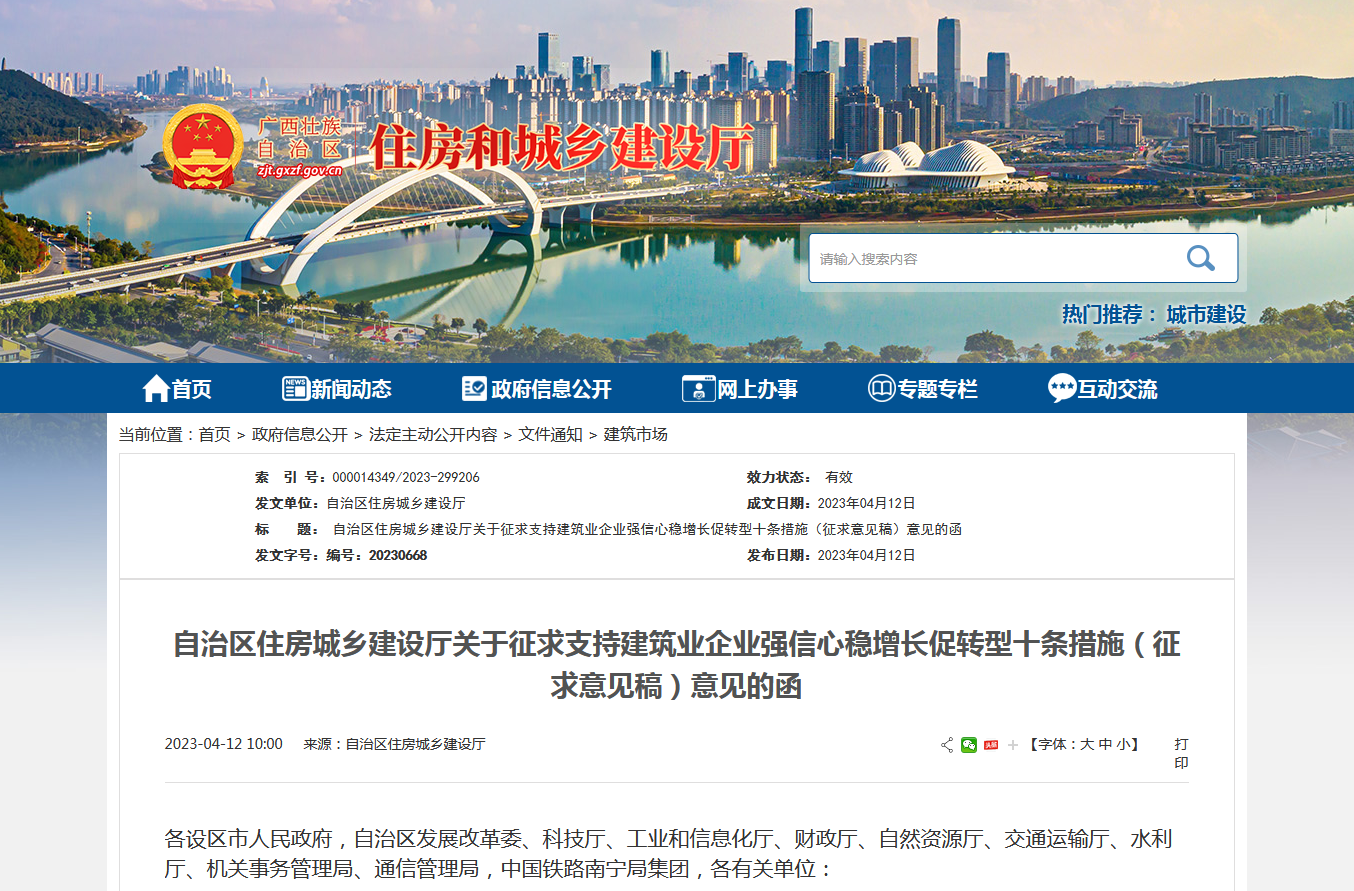 為全面貫徹黨的二十大精神,深入落實中央、全區(qū)經(jīng)濟(jì)工作會議部署要求,推進(jìn)政策加力助力全區(qū)經(jīng)濟(jì)整體好轉(zhuǎn),積極幫助我區(qū)建筑業(yè)企業(yè)增強(qiáng)發(fā)展信心,持續(xù)推動全區(qū)建筑業(yè)高質(zhì)量發(fā)展,我廳起草了《關(guān)于支持建筑業(yè)企業(yè)強(qiáng)信心穩(wěn)增長促轉(zhuǎn)型十條措施》(征求意見稿),現(xiàn)印發(fā)給你們征求意見。請各單位認(rèn)真研究,于2023年4月27日前將修改意見和建議(含電子文檔)反饋我廳,逾期未反饋意見視為無意見。