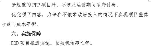 (四)應(yīng)明確項目實施模式。PPP項目需滿足國家有關(guān)管理要求,應(yīng)適時納入財政部、國家發(fā)展改革委PPP項目庫。鼓勵推廣生態(tài)環(huán)境整體解決方案、托管服務(wù)和第三方治理。EOD項目要參考《生態(tài)環(huán)境部等三部委:向各地征集第二批EOD模式備選項目》(環(huán)辦科財函〔2021〕468號,以下簡稱《通知》)基本要求,確保生態(tài)環(huán)境治理與產(chǎn)業(yè)開發(fā)項目有效融合、收益反哺、一體化實施。