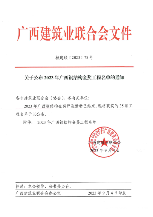 “廣西鋼結(jié)構(gòu)金獎”是由廣西建筑業(yè)聯(lián)合會設(shè)立的廣西鋼結(jié)構(gòu)優(yōu)質(zhì)工程最高榮譽獎項,獎項從工程質(zhì)量與管控、施工難度、技術(shù)創(chuàng)新、工程管理四個方面評選,旨在鼓勵和表彰區(qū)內(nèi)優(yōu)質(zhì)鋼結(jié)構(gòu)項目,提高廣西建筑鋼結(jié)構(gòu)工程的質(zhì)量。