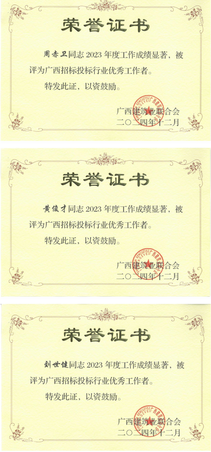 近日,廣西建筑業(yè)聯(lián)合會發(fā)布了《關于2023年度招標投標行業(yè)優(yōu)秀企業(yè)和優(yōu)秀工作者名單的通知》,恒基咨詢憑借在招標投標領域的優(yōu)秀表現(xiàn),榮獲2023年度“廣西招標投標行業(yè)優(yōu)秀企業(yè)”稱號。同時,公司4名員工獲評“廣西招標投標行業(yè)優(yōu)秀工作者”。