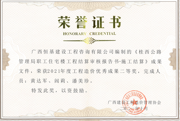 2021年度工程造價(jià)優(yōu)秀成果二等獎(jiǎng)