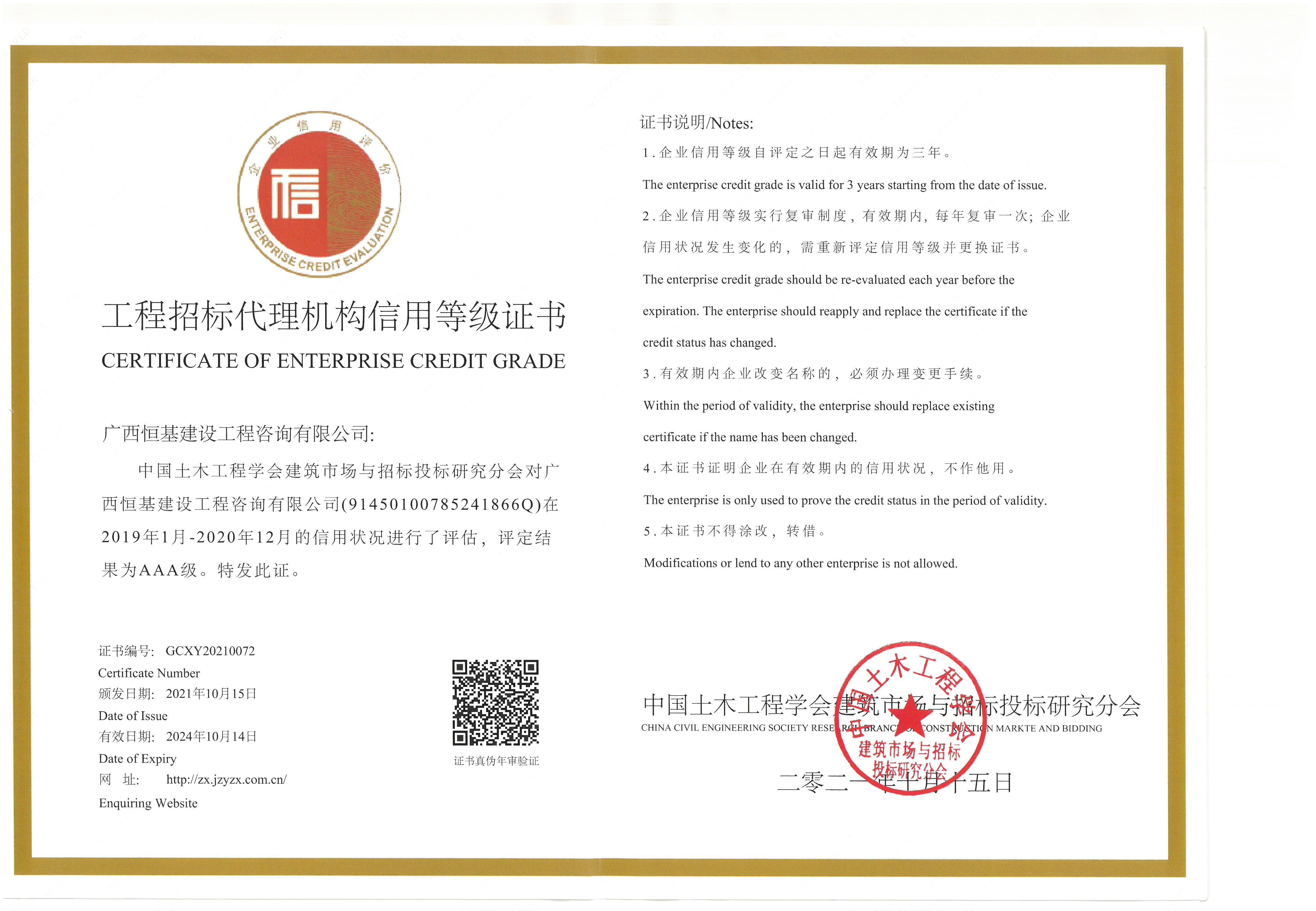 工程招標(biāo)代理機(jī)構(gòu)信用等級(jí)證書(shū)AAA級(jí)